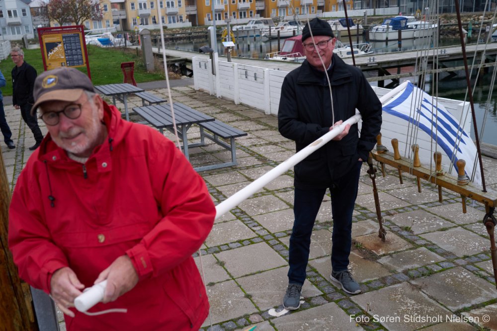 Med andre ord: Tiden er til at nedhaling af standeren i Rudkøbing Sejlklub. Denne traditionelle begivenhed samlede medlemmerne omkring signalmasten lørdag eftermiddag. Et par modne medlemmer, Poul Tom Hansen og Flemming Hansen, halede den vejrbidte stander ned.